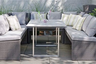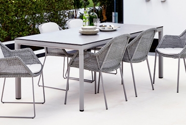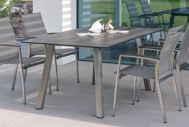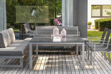 Die Wohnzimmertische rücken auf die Terrasse. Das neue Tischgestell bietet enorm viel Fußfreiheit! Ideal für Speiselounges welche um die Ecke aufgestellt werden. Die Keramiktischplatten sind in ...