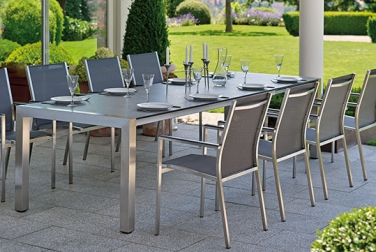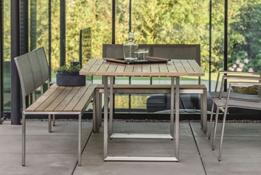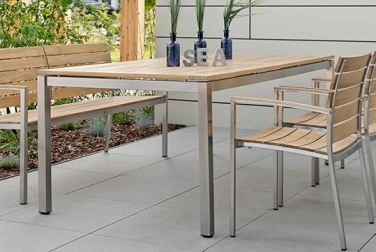 Warme Akzente durch Teakleisten und gerade Linien aus Edelstahl formen den Stuhl sowie die Bank Savona. Beispiel Abbildung: 3 x Stapelstuhl je € 429.- 1 x Bank 160 cm € 1195.- 1 x Tischplatt...