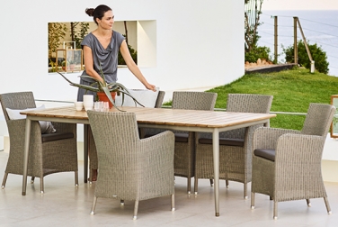 Evoee – eine raffinierte Kombination aus outdoortauglichen Materialien und hohem Komfort, dank einer extra hohen, leicht schwingenden Rückenlehne in Kombination mit einem Tisch aus Edelstahl mit Si...