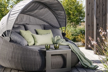 das Greta Tagesbett lädt zu entspannten Momenten im Freien ein. Weiteren Komfort bietet die separat mehrfach verstellbaren Rückenlehnen. Das verstellbare Dach bietet aus Stoff bietet Schutz vor Sonn...