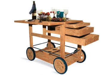 Ausklappbare Seitenflügel, die fast einen kleinen Tisch aus dem Barwagen machen, einige Laden zur Aufnahme von Besteck und anderem Nützlichen, ein großes Ablagefach und ein integrierter Flaschen- u...