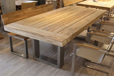 Dieser von seiner Erscheinung her sehr massive Tisch erhält seine Ausstrahlung durch das gebürstete Recyclingholz. Zapflöcher und Verbindungstellen sind zimmermannsmäßig ausgebessert. An der ...
