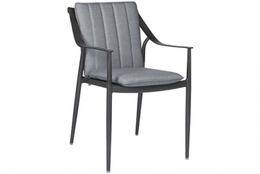 Die zurückhaltende Struktur des Outdoorstoffs in seidenschwarz und das mattschwarze Gestell harmonieren mit der Sitzschale des Artus Speisestuhls.
