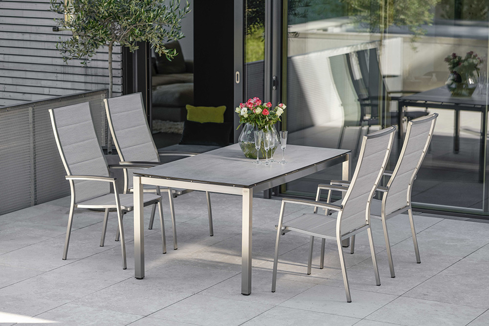Cardiff zeichnet sich aus durch seine klare und gerade Form und ist damit ein besonders schöner zeitloser Sessel. Aus hochwertigem Edelstahl der Güteklasse 304 ist er besonders resistent gegen Rost und damit sehr pflegeleicht. Mit gepolsterten Sitz – und Rückenlehne. Neu mit extra hoher Rückenlehne für noch mehr Komfort.