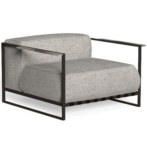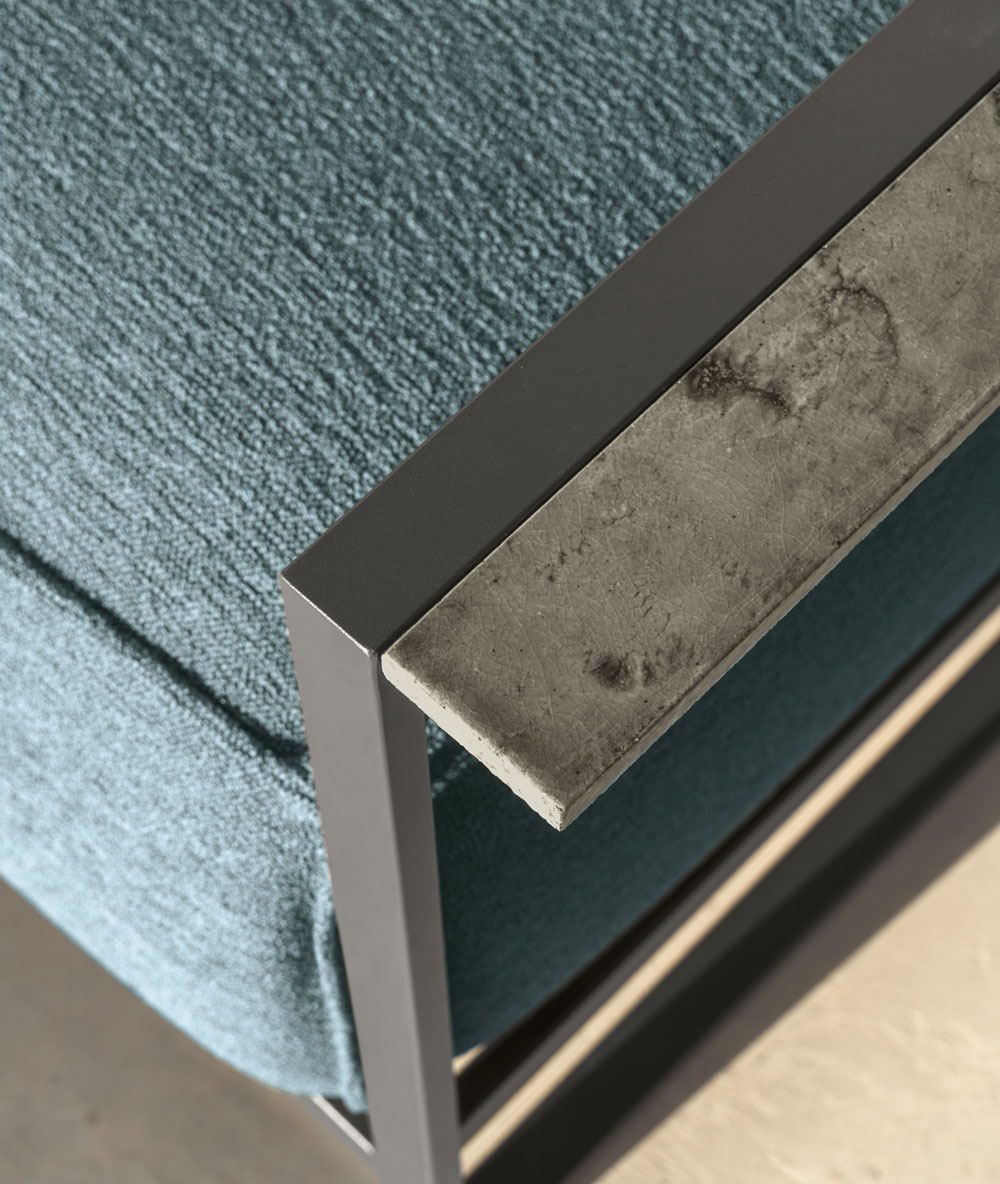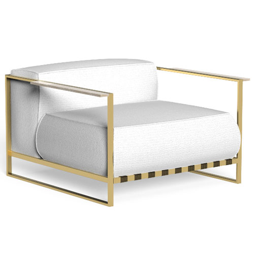 Die einfachen grafischen Linien der Rahmen verbinden perfekt die einzigartigen Elemente, die ihre Identität bestimmen, wie die Gurte der Sitze oder die Marmor- und Holzeinsätze der Armlehnen.