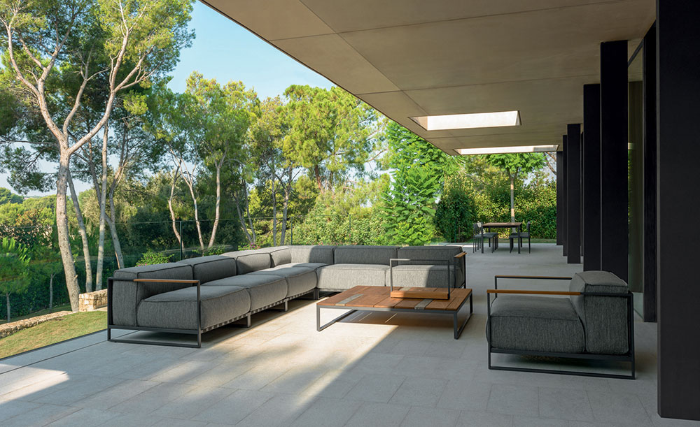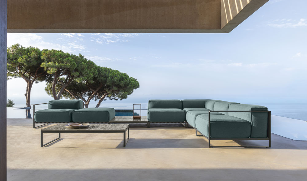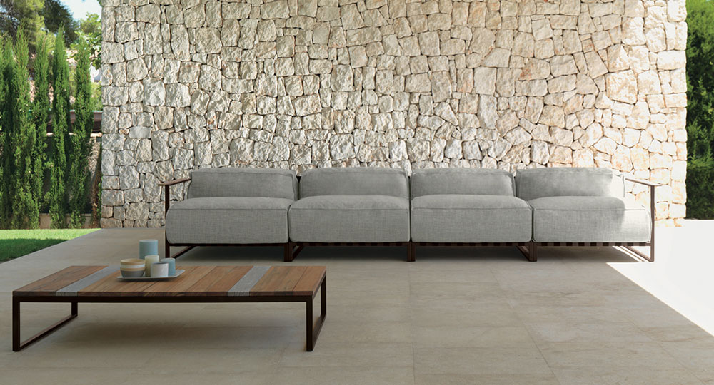 Die modulare Lounge besteht aus 6 Elementen, die viele verschiedene Kombinationen ermöglichen, um die perfekte Harmonie im Ambiente zu erreichen. Der Edelstahlrahmen ist pulverbeschichtet. Sitze und Rückenlehnen werden von Polyestergurten getragen, die speziell für den Außenbereich entwickelt wurden. Kissen mit abnehmbaren Bezügen, leicht zu waschen und wetterbeständig. Schnelltrocknende Schaumstoffpolsterung. Die Armlehnenlatten sind je nach gewählter Farbkombination aus Iroko-Holz, Steinholz, Titan-Travertin oder Silber-Traventin.