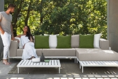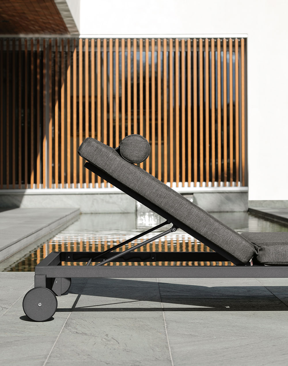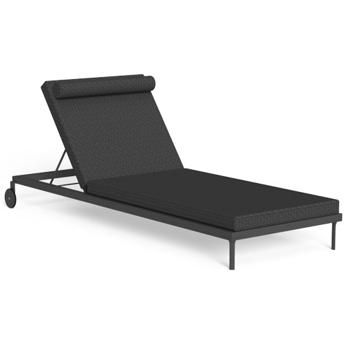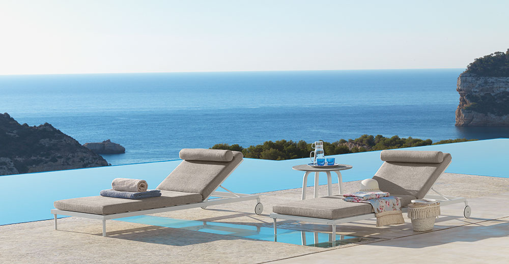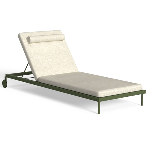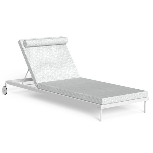Die Cleo Sonnenliege erinnert an die geometrischen Linien der voluminösen Wohnelemente, aus denen die Kollektion besteht. Die Struktur besteht aus pulverbeschichtetem Aluminium und die Rückenlehne ist verstellbar. Die Liege hat Räder und kann gestapelt werden. Die Kissen sind abnehmbar, leicht zu waschen und wetterbeständig. Schnelltrocknende Schaumstoffpolsterung.