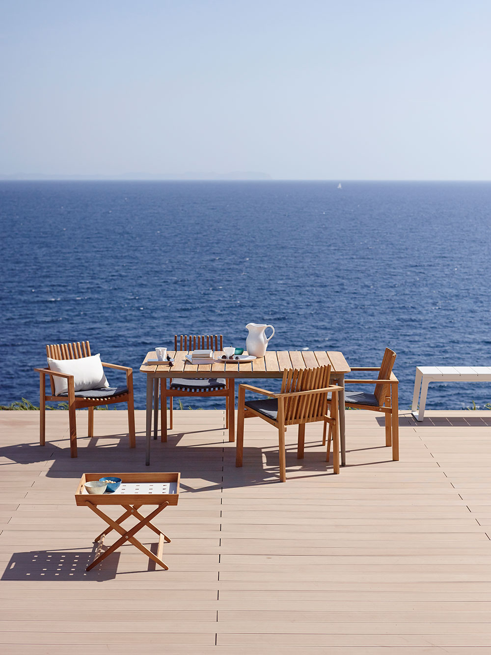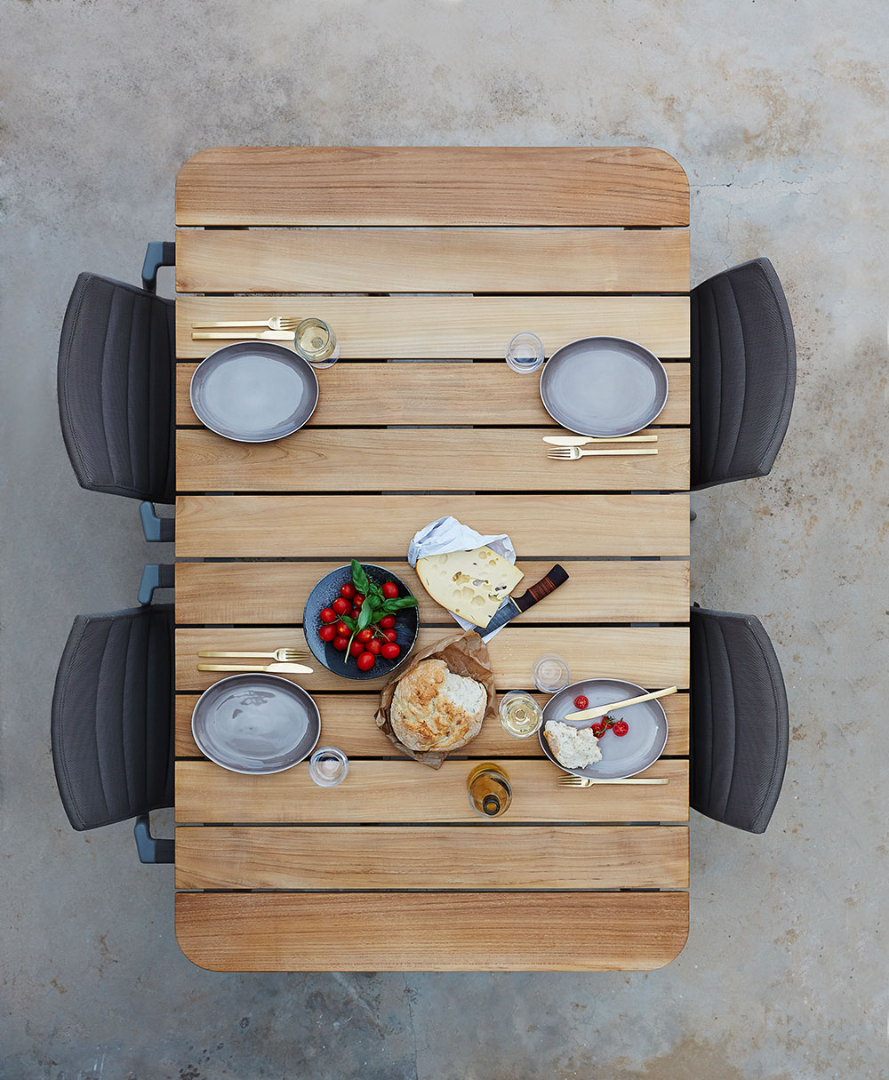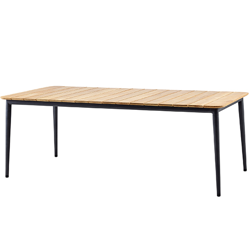 Der elegante Core Gartentisch ist eine moderne Ausgabe der klassischen Teakgartenmöbel. Das Gestell ist aus pulverlackiertem Aluminium und die Tischplatte aus Teaklamellen gefertigt. Diese Materialien sind witterungsbeständig und pflegeleicht und der Tisch kann das Jahr über im Freien gelassen werden. Die unbehandelten Teaklamellen haben einen natürlichen, warmen Farbton und werden mit der Zeit eine silber-grau Patina erhalten, wenn sie nicht geölt werden.
