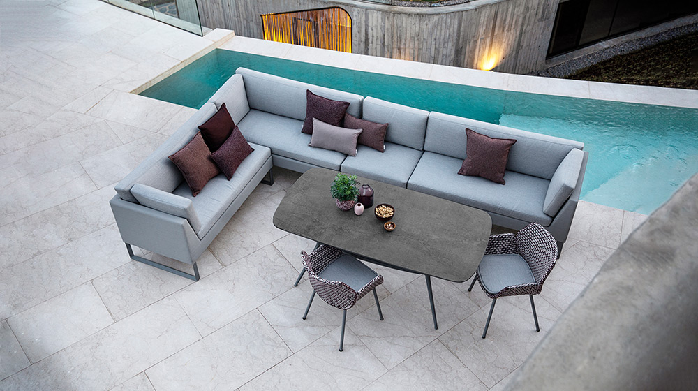 Flex Speise – Lounge ist ein aus Modulen aufgebautes System, das sich ausgezeichnet für den Gebrauch im Freien eignet. Flex lässt sich als normales Lounge-Sofa zum Entspannen nutzen, oder um darin zu speisen. Durch das einzigartige und flexible Design bietet Flex mehrere Funktionen: entspannende Lounge-Gruppe und Essplatz, an dem man ein gutes Mahl genießen kann. Die Flex-Dining Lounge ist aus witterungsbeständigem grauem Cane-line Tex® mit weichen komfortablen Sitzkissen aus Sunbrella® Natté erhältlich. Die Sitzkissen und Materialien lassen sich leicht pflegen und sind mit Cane-line QuickDry-System erhältlich, einer speziellen Technologie, die den Komfort erhöht und dafür sorgt, dass die Sitzkissen nach einem Regen schnell wieder trocknen.