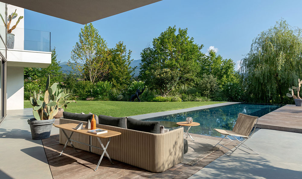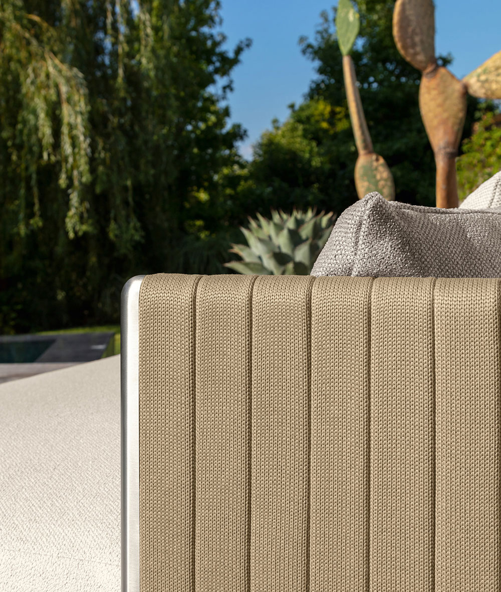 Die modulare Lounge der George-Kollektion ist das Flaggschiff der Talenti-Gartenkollektion. Die Leichtigkeit der Linien und der Komfort des Sitzes stehen im Kontrast zur Stärke und Haltbarkeit der Edelstahlstreben der Struktur, die hinter dem leicht gepolsterten synthetischen Gurtgewebe, das die Rückenlehne formt, sichtbar bleiben.