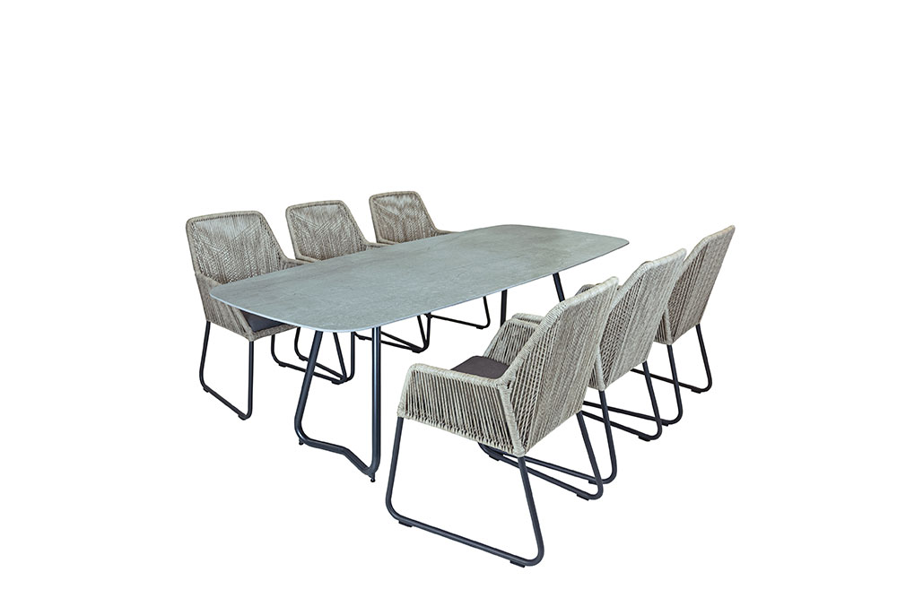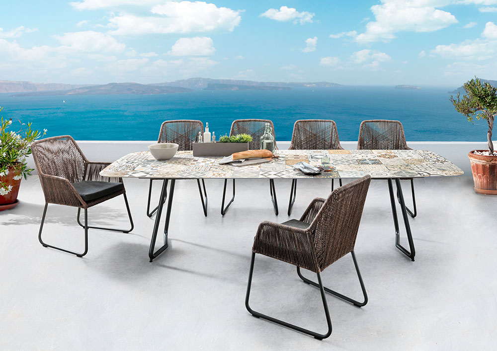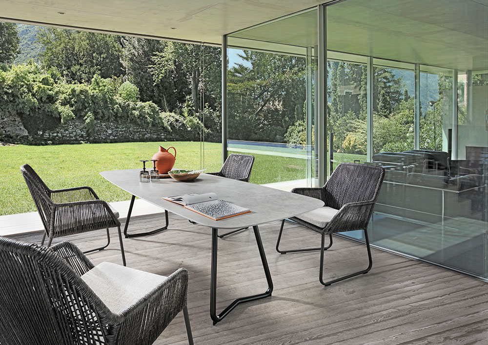 Sie suchen einen Tisch mit dem gewissen Extra? Dann lassen Sie sich von “Jura” begeistern. Für das exklusive Outdoor-Möbel kombiniert die Firma SIT eine Keramik oder Dektonplatte mit einem modernen Kufengestell. Die großzügig gerundeten “Ecken” lassen die Tischplatte oval erscheinen und schenken dem Möbelstück eine besonders harmonische und weiche Ausstrahlung. Das Kufengestell aus Rundrohr setzt einen modernen Akzent.