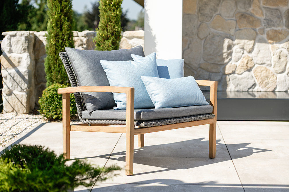 Die Lounge Leah aus Teakholz vereint die besondere Formensprache der bekannten Serie Skelby mit dem beliebten Material Teak. Der Bezug aus einer hochwertigen Synthetikfaser erzeugt zudem ein angenehmes Sitzgefühl.