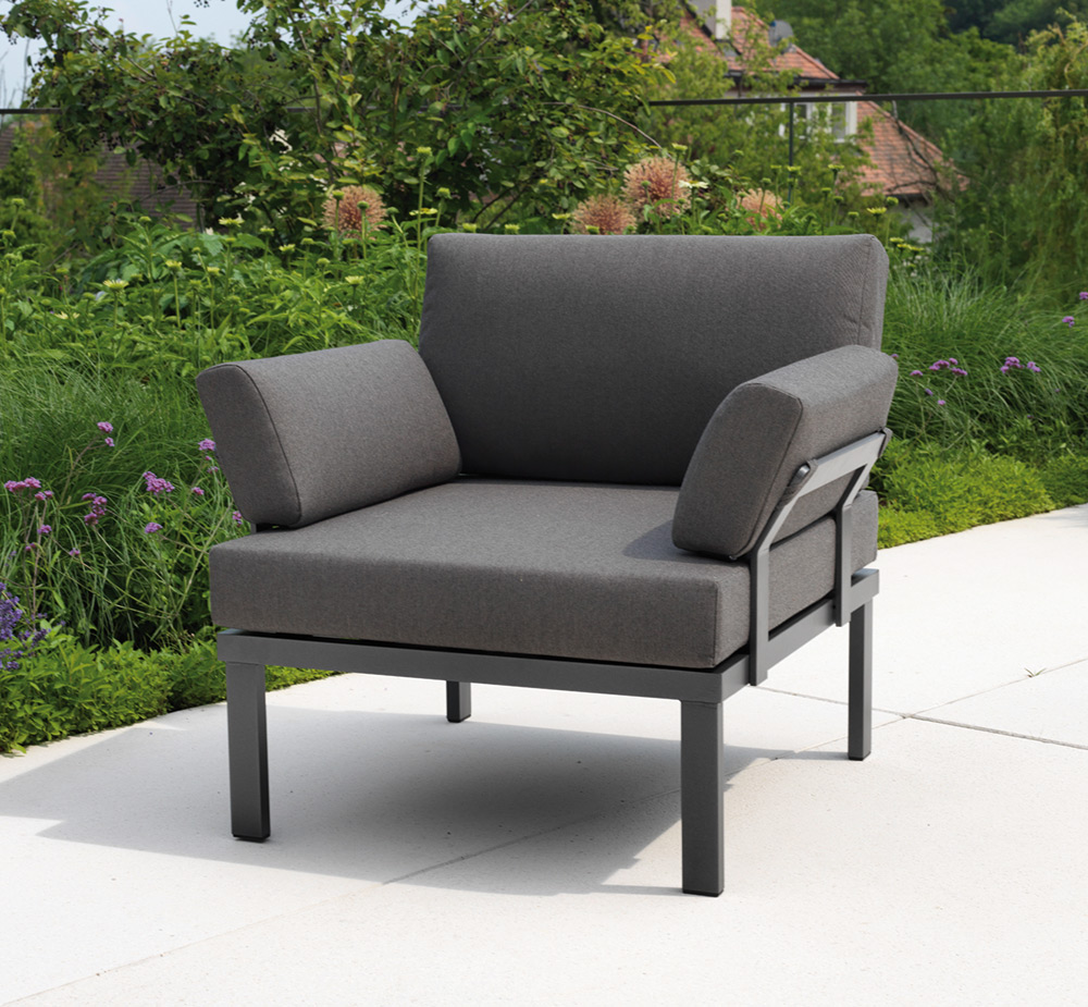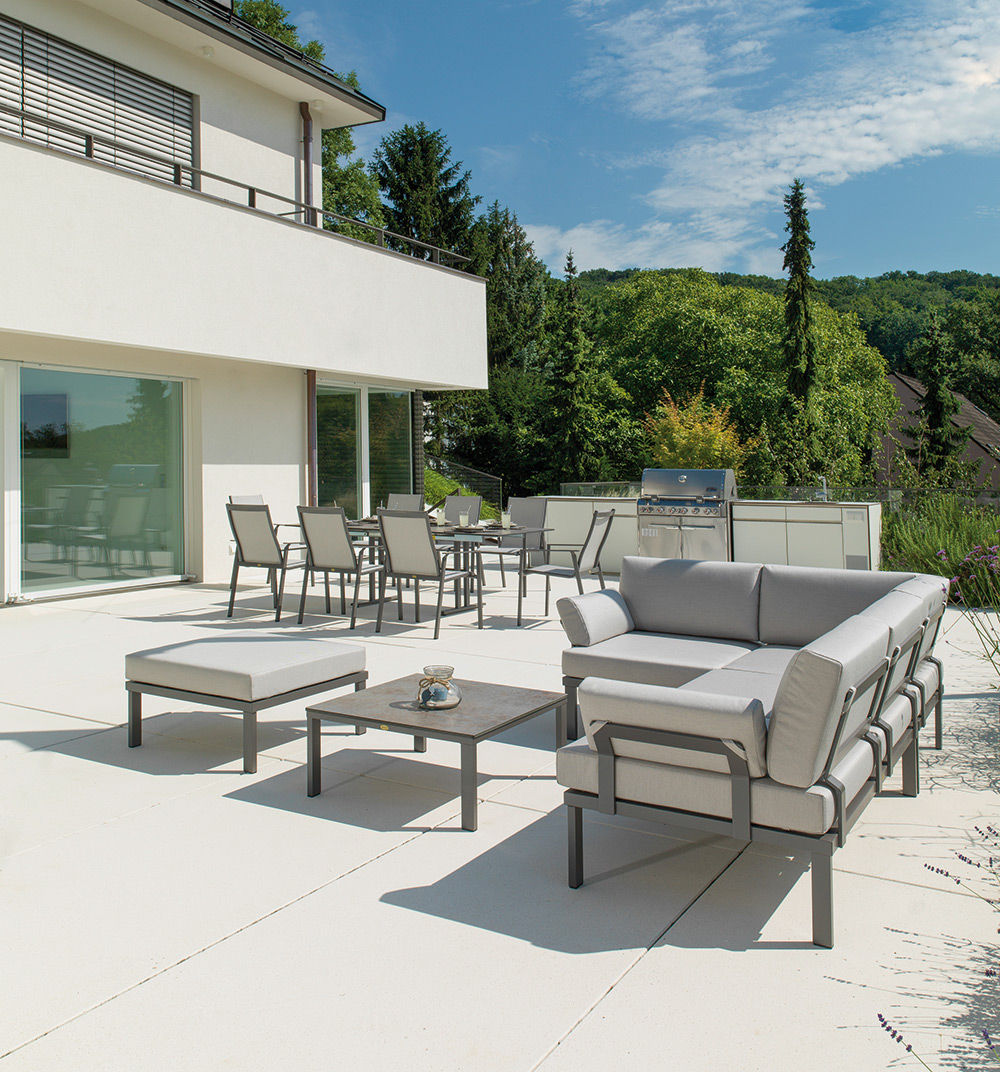 Die Loungegruppe Lido vereint die Modularität und Flexibilität des Schwestermodells Sylt mit Mondänität und Eleganz. Die klare Linienführung in der Frontansicht und die raffiniert gelösten Rückenlehnen in der Rückansicht, machen die Loungegruppe Lido zu einem unverwechselbaren Highlight für moderne Terrassen. Der Rahmen aus pulverbeschichtetem Aluminium ist extrem witterungsbeständig, und die wetterfesten Kissen aus hochwertigem, schmutzresistentem, wasserabweisenden Sunbrella-Gewebe gefüllt mit „dryfeel“-Schaumstoff erlauben einen ganzjährigen Outdooreinsatz. Durch die Vielfalt an unterschiedlichen Modulen passt sich die Loungegruppe Lido ganz individuell Ihren Gestaltungswünschen an. Ob auf städtischem Balkon oder großzügiger Gartenterrasse – Sie werden in jedem Fall die passende Konstellation finden.