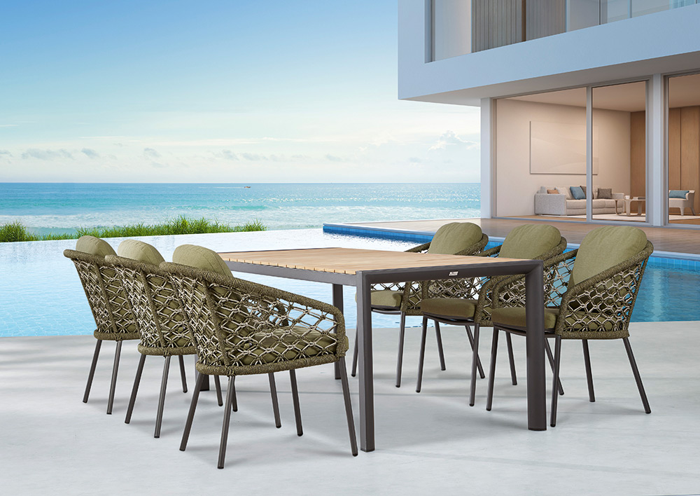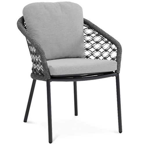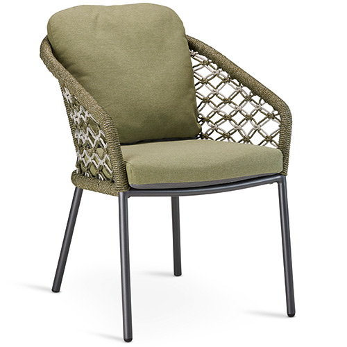Der Mali Diningsessel besteht aus einem wetterfesten Aluminiumgestell, das Makrameegeflecht ist reißfest und absolut wetterbeständig. Hochwertige Sunbrella-Stoffbezüge, mit einer wasserabweisenden Schaumfüllung, machen den Stuhl absolut outdoortauglich.