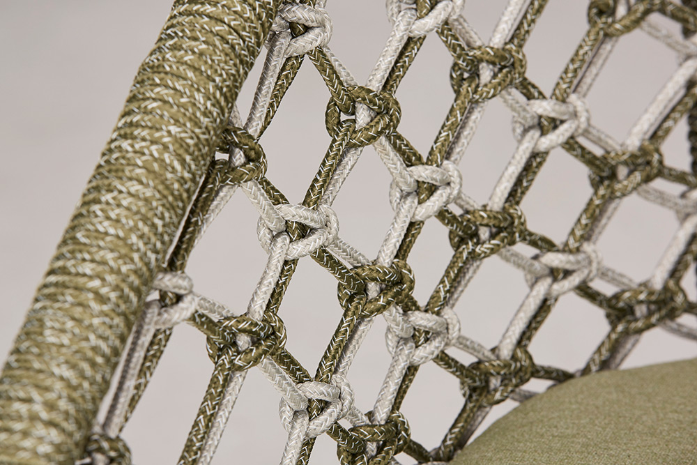 Das aus dem Orient kommende Kunsthandwerk des Makrameesflechten steht im Zentrum des Designs. Die handgearbeiteten, farblich aufeinander abgestimmten Knüpfelemente, geben dem Stuhl seine orientalische Anmut. Das große, weiche Rückenkissen, in grober Webstruktur, unterstützt nicht nur diesen exotischen Look, sondern bietet auch überzeugenden Sitzkomfort.