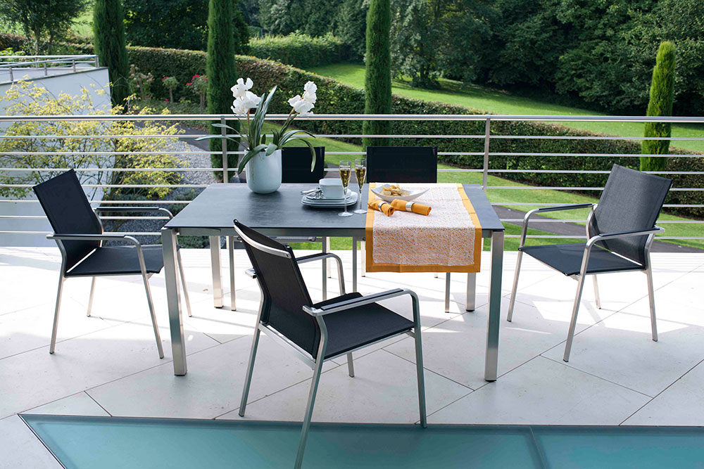 Tischgestell aus Edelstahl, Edelstahl eisengrau lackiert oder Aluminium.