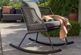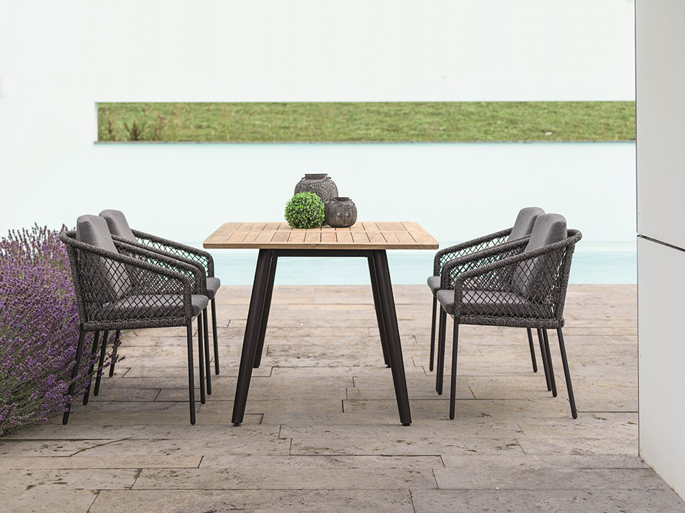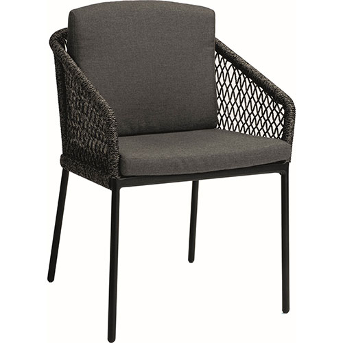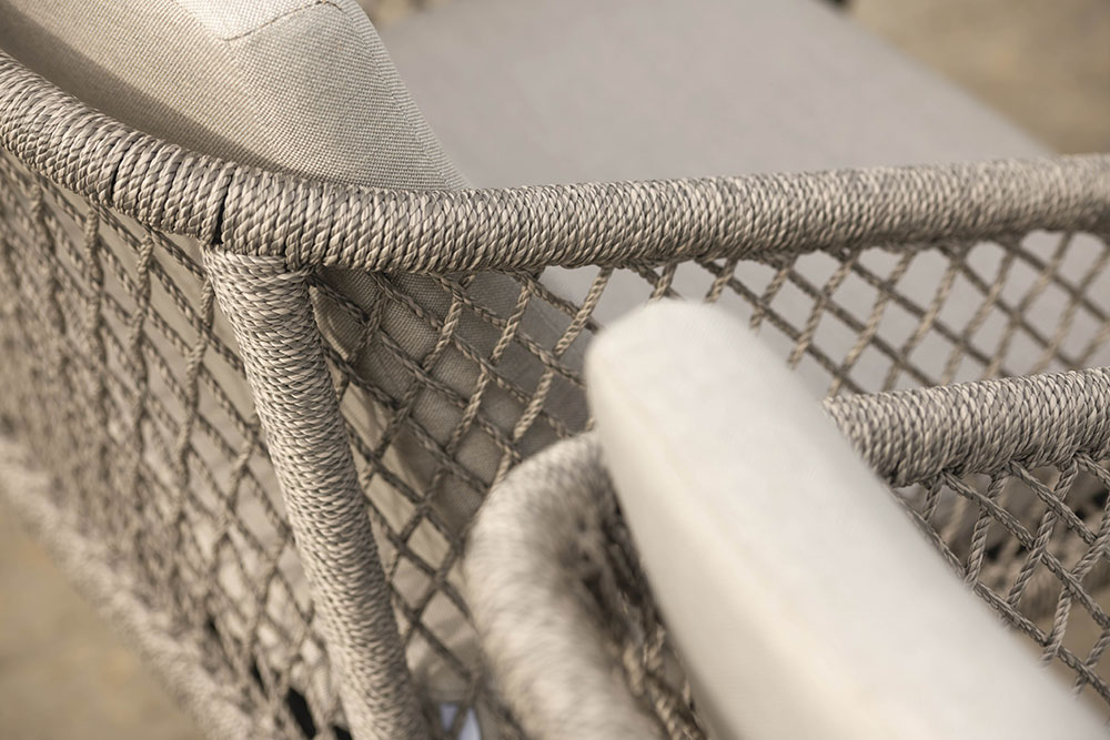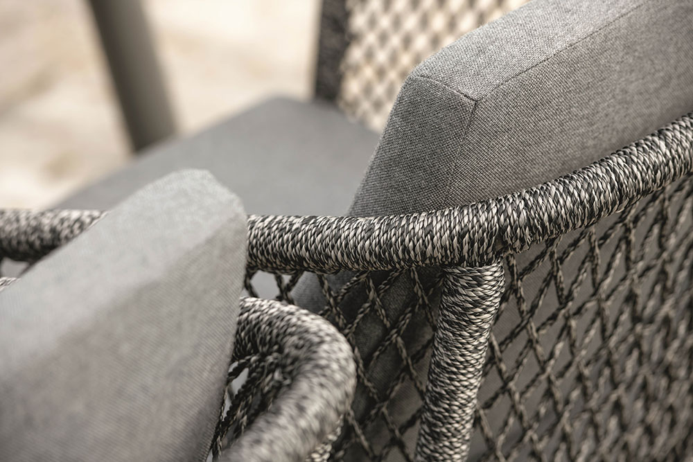 Die Kordel in Pepper oder Salt strahlt kühle Eleganz aus. Durch die Einzelbeine wird der Stuhl in seiner Silhouette reduziert, der Blick dadurch stärker auf die detaillierte offene Flechtung gerichtet.