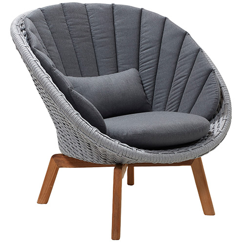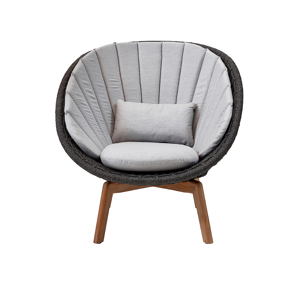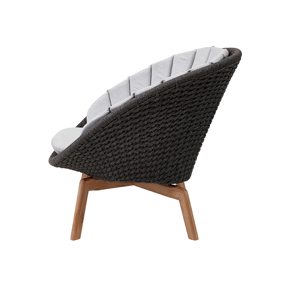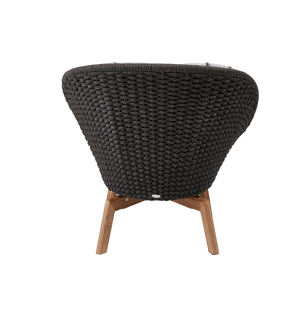 Der stylische Loungesessel „Peacock“ ist ein besonders komfortabler Designer-Sessel. Die großzügige, schalenförmige Rückenlehne aus dunkelgrauem Seil ist ein optisches Highlight und bietet ihnen schützenden Halt und Bequemlichkeit auf ganzer Linie. Mit seinen Beinen aus Teakholz strahlt der Sessel eine warme Atmosphäre der Gemütlichkeit aus.