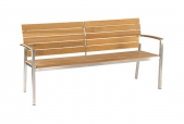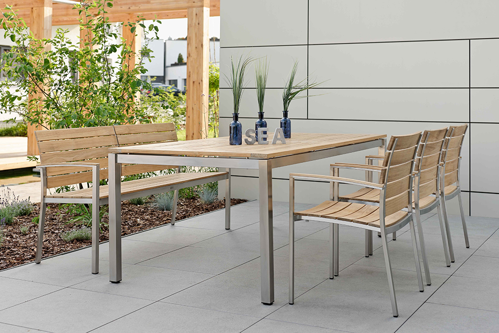 Warme Akzente durch Teakleisten und gerade Linien aus Edelstahl formen den Stuhl Savona.