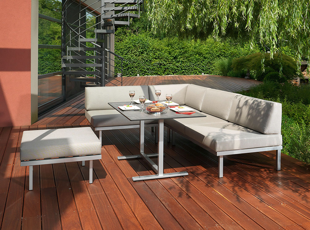 Die Lounge Sylt vereint modulare Vielfalt mit hohem Sitzkomfort. Der Rahmen aus pulverbeschichtetem Aluminium ist extrem witterungsbeständig, und gemeinsam mit den wetterfesten Kissen aus hochwertigem, schmutzresistentem, wasserabweisendem SUNBRELLA-Gewebe gefüllt mit „dryfeel“-Schaumstoff ist diese Lounge die richtige Wahl für einen ganzjährigen Outdooreinsatz.